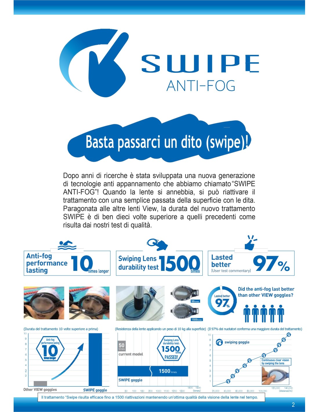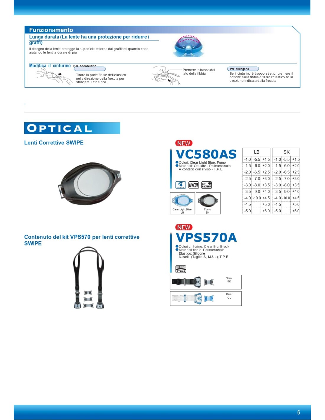 Le lenti Vc-580 sono disponibili in due colori, fumo e blu. Hanno poi una vastissima possibilità di gradazione, positiva da +1,00 a +6,00 (di mezzo grado in mezzo grado fino a 5,00 poi il 6,00) e negativa da -1,00 a -10,00 (di mezzo grado in mezzo grado fino a -7,00 poi crescendo di un grado fino a -10,00). Sono tutte dotate del trattamento rivoluzionario “SWIPE”, un antifog dalla durata 10 volte superiore a quelli disponibili precedentemente e approvato FINA.