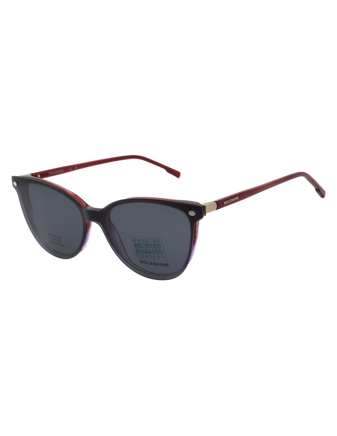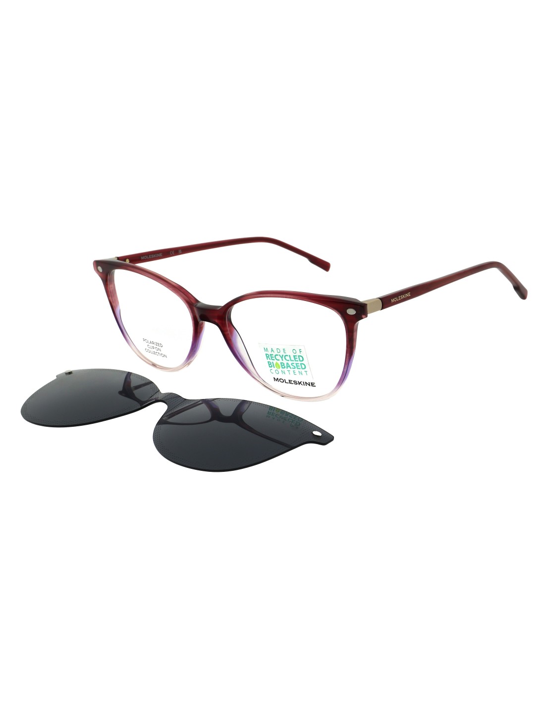 Forma a farfalla femminile, con acetato riciclato “biobased” (35% da acetati riciclati e 40% da cellulosa naturale). Asta in acetato “biobased" e clip on magnetico e polarizzante