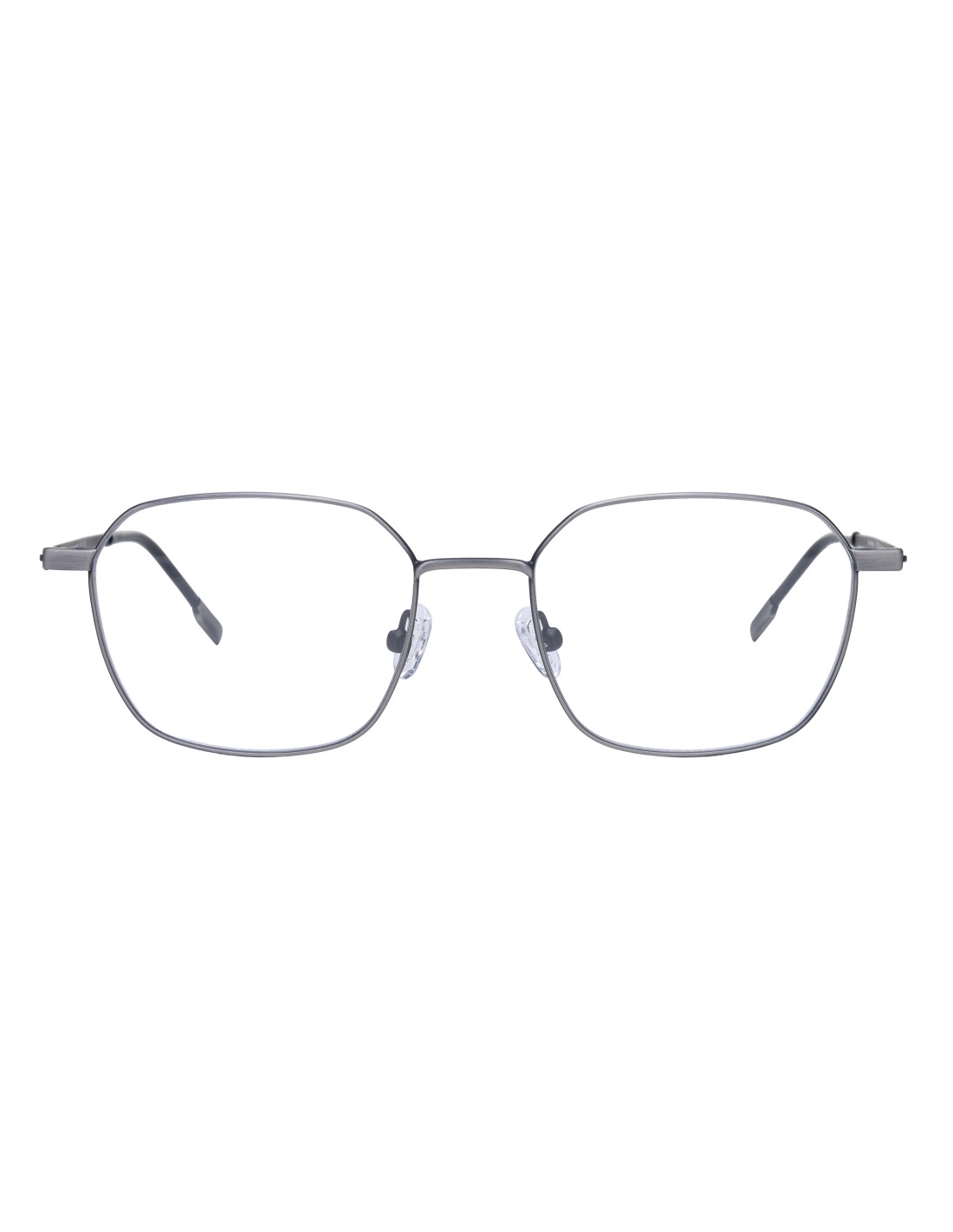 Occhiale in acciaio ipoallergenico, forma rettangolare. Guaina in appoggio sull'orecchio in caucciù anallergico.